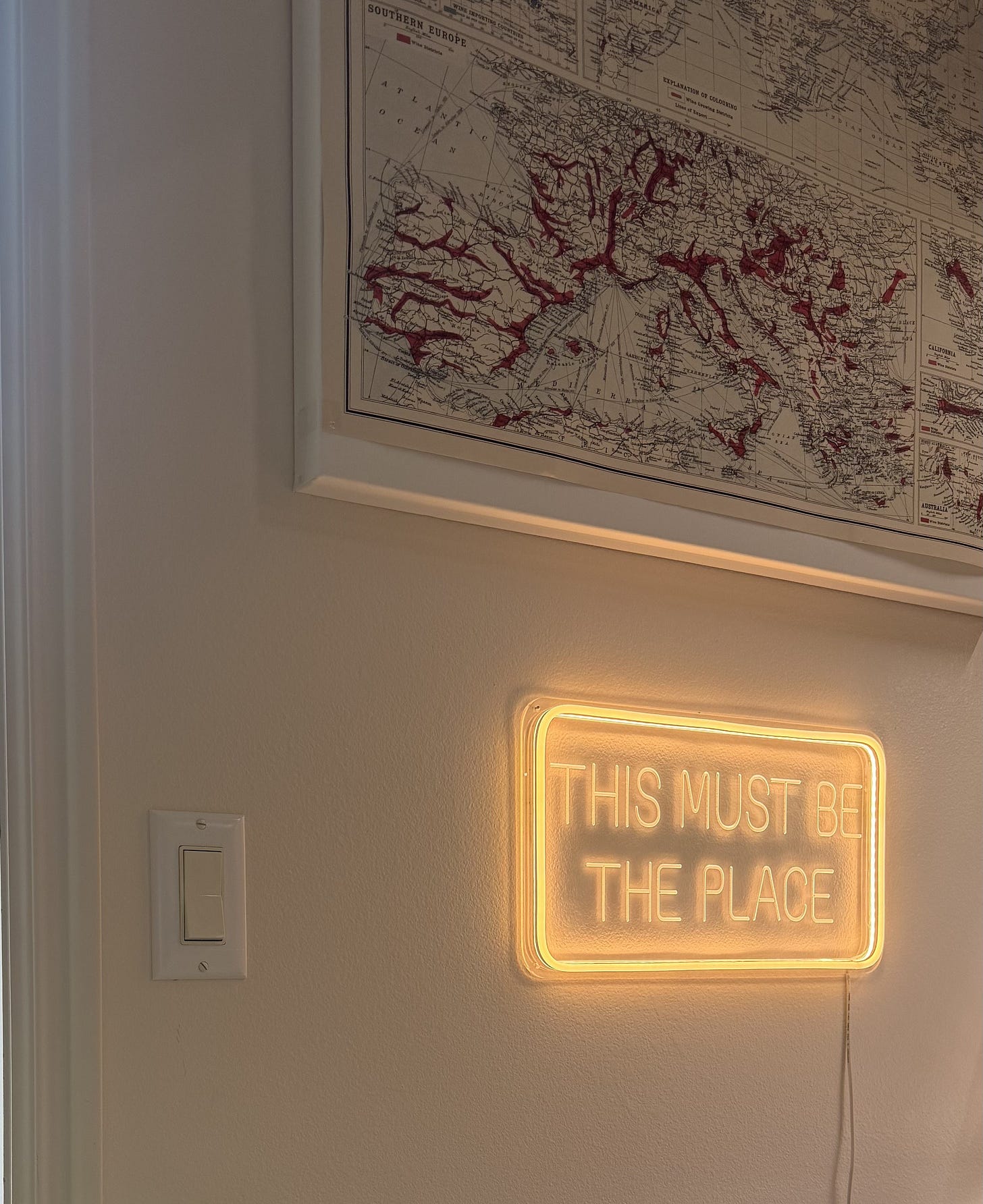 I have a lot of them. A monstera that has been with me through more than I’ll name right now. Propagation shelves. Grow lights. A blue armchair with a yellow throw. And a small framed sign on the wall that says: THIS MUST BE THE PLACE.